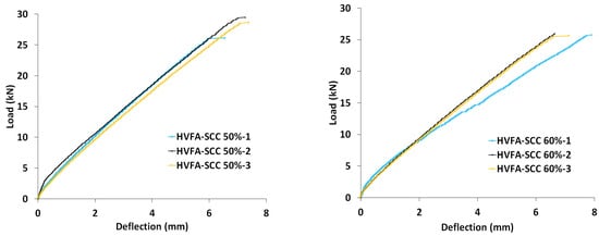 Table 5 summarizes the key points of the HVFA-SCC beam behavior extracted from the load-deflection curve. In general, HVFA-SCC 50% has slightly higher compressive strength than HVFA-SCC 60%. This affects the ultimate shear strength of these concretes. It is also interesting to note that loads corresponding to the first appearance of primary diagonal cracks are in the 85–90% range of ultimate shear strength values. This indicates that, once the primary diagonal cracks are formed, they rapidly propagate and develop in such a way as to cause shear failure.