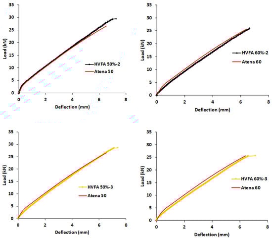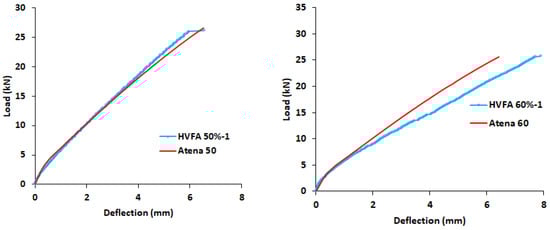 The comparison of the load-deflection curve obtained from numerical simulation and experimental laboratory for the six beams is presented in Figure 10. In general, the trend of the curve of the numerical simulation is in agreement with the experimental results. The similarity of these results can be further quantified by comparing the shear strength and maximum deflection obtained from the two methods. The ratio of the average shear strength of the test results and the numerical simulation, Vtest/Vatena, and the mean maximum deflection of the test results and the numerical simulation, δtest/δatena, are shown in Table 6. The Vtest/Vatena of HVFA-SCC 50% is 1.06 and its corresponding δtest/δatena is 1.08. The ratios indicate that the difference between the measured and numerical simulation is below 10%. For HVFA-SCC 60%, the difference is within 13%. Thus, the numerical modeling using 3D ATENA Engineering in this research is quite satisfactory, especially for 50% HVFA-SCC. On the basis of these results, beam modeling with 3D ATENA Engineering software can be further developed to conduct parametric studies in order to evaluate various parameter effects.