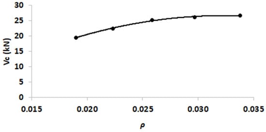 The effect of the reinforcement ratio can be traced from the contribution of longitudinal reinforcements in preventing the propagation and development of diagonal tension cracks. An increase in reinforcement ratio causes a smaller strain in the reinforcement (see Figure 12). Consequently, it will prevent propagation of diagonal tension crack penetrating into the compression zone and maintain the tightness of the diagonal tension crack width. A higher reinforcement ratio also provides a better reinforcement’s ability to withstand the vertical force transfer via dowel action. However, at certain point, concrete cover may not be able to withstand the greater vertical force transfer (see Figure 7 and Figure 8). Thus, the increase in the reinforcement ratio is no longer effective in increasing the shear capacity, as shown in Figure 11.