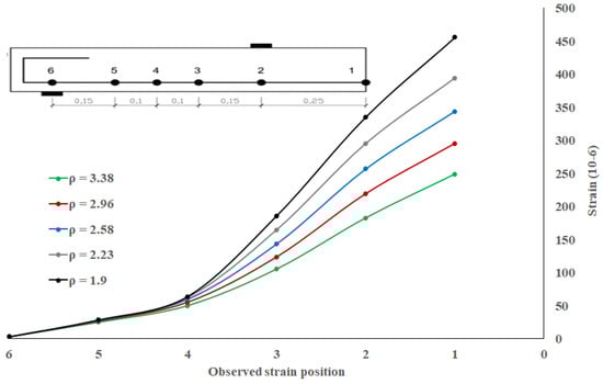 The effect of reinforcement ratio (ρ) on the longitudinal strain at various positions.