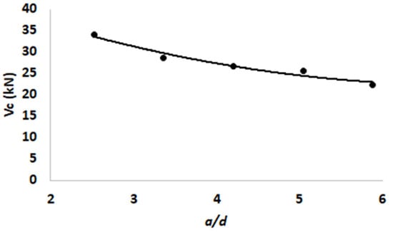 The effect of the shear span to beam effective depth ratio (a/d) is presented in Figure 13, which shows the increase in shear strength when a/d decreases. There are two things that need to be considered in order to interpret the results shown in Figure 13. Firsly, the a/d value is set in the range of 2.5–6.0 and secondly, the a/d variation is simulated by changing the shear span (a) but by maintaining the cross-sectional size of the beam. The first stipulation provides a limitation related to the shear resistance mechanism of reinforced concrete beams, which can be distinguished as beam action and arch action. Some literature notes that arch action is effective in short shear spans (a/d ≤ 2). Brown et al. [] showed that asymmetrically loaded reinforced concrete beams will collapse at large shear spans (a/d = 3.5–5.8) compared to short shear spans (a/d=1.7) due to effective arch action of the shorter beams. In the numerical simulation of this research, the limitation of a/d in the 2.5–6.0 range was intended so that the beam collapse occurred shortly after the primary diagonal tension crack formed. Hence, the beam was not significant enough to develop shear resistance through the arch action mechanism. This failure mechanism corresponds to that observed in the test beams (a/d = 4.2), as described in Section 4.1.
