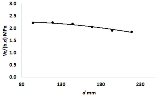 Figure 14 shows the effect of the effective depth of the beam d on the shear strength of the beam (Vc/b.d). The shear strength is expressed as Vc/b.d to emphasize the effect of d as a representation of the size effect on the shear strength of concrete. Figure 14 indicates that the larger the beam size, the smaller the value of the shear strength. This is in line with the theory put forward by Bazant et al. [] and which is also confirmed by the test results in other research [].