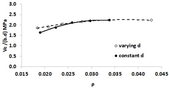 In Figure 15, the legend ‘constant d’ shows that the change in the value of ρ is obtained from the change in the value of As but the values of b and d are constant; while ‘varying d’ shows that the change in the value of ρ is obtained from the fixed values of As and b but the value of d changes. Therefore, the ‘constant d’ curve represents the effect of ρ on the shear strength of concrete. Meanwhile, the curve ‘varying d’ in Figure 15 indicates the effect of ρ caused by changes in the value of d. In this case, the higher the value of d, the lower the value of ρ and vice versa. Thus, Figure 15 provides a clue that is consistent with the previous statement, i.e., the greater the value of d (or smaller ρ), the lower the shear strength. It is also interesting to note that the rate of decline of the ‘varying d’ curve is slower than the ‘constant d’ curve at ρ below 0.025. This indicates that, at ρ below 0.025, there is a difference between the effect of the reinforcement area As and the effect of the effective depth of beam d on the shear strength of the concrete. The effect of the size on the shear strength of the concrete is smaller than the effect of longitudinal reinforcement. This may be traced to the shear transfer mechanism in the diagonally cracked beam. In small ρ, a large strain will be sensitively induced in the longitudinal reinforcement. Hence, the small longitudinal reinforcement is unable to withstand crack propagation. As a consequence, the shear transfer contributed by the dowel action and the aggregate interlocking is not significant. In this condition, the shear strength of concrete is more dependent on the shear contributed by the concrete in the compression zone. At this small reinforcement ratio, a higher d could better provide a larger concrete compression zone.