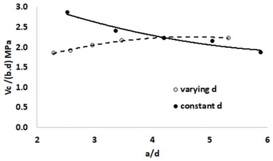 In Figure 16, ‘constant d’ legend shows that the change in the value of a/d is obtained from the change in the value of the shear span a, but both the width b and the effective depth d are constant; while ‘varying d’ shows that the change in the value of a/d is obtained from the constant value of shear span a and beam width b, but the value of d changes. Therefore, the ‘constant d’ curve can be marked to represent the effect of the shear span on the shear strength of the concrete. Meanwhile, the curve ‘varying d’ in Figure 16 indicates the effect of a/d caused by changes in the value of d on the shear strength of concrete. In this case, a higher d value causes a lower a/d value and vice versa. Thus, Figure 16 provides a clue that is consistent with the previous statement, i.e., the greater the value of d (or a/d is smaller) will cause the shear strength to decrease.