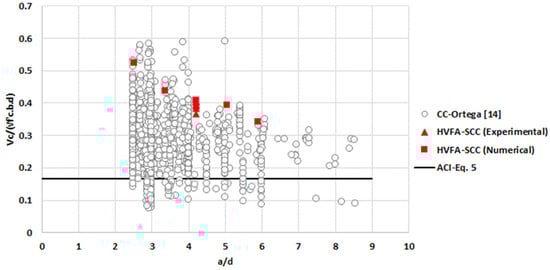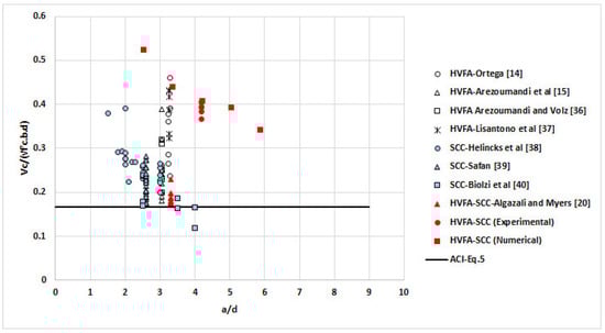 The estimation of shear strength according to the ACI design code is based on a conventional concrete shear strength database. Therefore, mapping the shear strength of HVFA-SCC beams in a conventional concrete shear strength database can be a justification for whether or not to modify the formula.