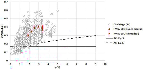 The concrete shear strength database used in this research refers to the Ortega study []. Ortega has collected 994 conventional concrete shear strength data, which represent the shear strength of concrete beams with various compressive strengths, a/d ratio, reinforcement ratio, cross section size, etc. The database is redrawn in Figure 17 and Figure 18. The shear strength values of HVFA-SCC beams obtained in this research, both the experimental results and numerical simulations, are also presented in the database. In addition, the estimated shear strength values from Equations (3) and (4) are also shown. It can be seen that the shear strength of the HVFA-SCC beam is within the upper bound (Figure 17) and the mean (Figure 18) of the conventional beam shear strength database. This confirms that the ACI design code is applicable for HVFA-SCC.