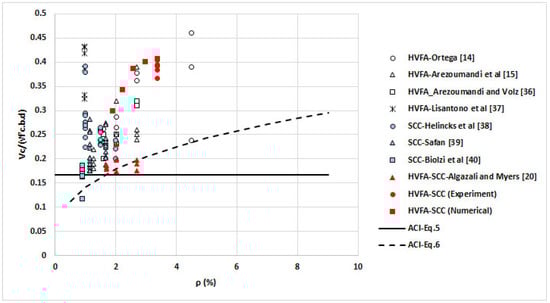 The value of HVFA-SCC shear strength from the results of this study is also presented in other non-conventional concrete shear strength databases [,,,,,,] (see Figure 19 and Figure 20). Although the amount of data used in constructing Figure 19 and Figure 20 is limited, it shows that the non-conventional concrete meets the shear strength values estimated from the ACI design code. In Figure 19 and Figure 20, the value of HVFA-SCC shear strength from this research is higher than the value of HVFA-SCC shear strength from Algazali et al. The difference may be related to the size effect: the HVFA-SCC beam from Algazali measured 305 × 457 mm2 while the HVFA-SCC beam in this research was 100 × 150 mm2. The ACI design code also recognizes this size effect by providing a modification factor whose value depends on the effective depth of the beam. The greater the beam size, the smaller the value of the modification factor.
