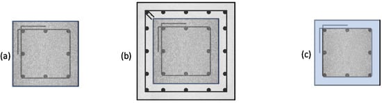 (a) Deficient cross-section; (b) Retrofit with reinforced concrete jacket; (c) Retrofit with cover replacement using SHCC.
