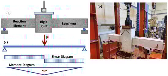 Overall, the test setup resembles a simply supported system of a beam–column subassembly loaded at midspan with a point load, which generates the moment and shear diagrams shown in Figure 2c.