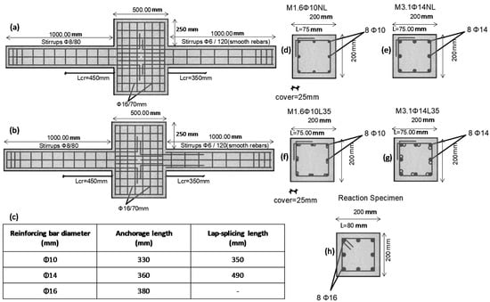 (a) M1.6Φ10ΝL steel reinforcement; (b) M1.6Φ10L35 steel reinforcement; (c) Table of lap-splicing and anchorage lengths; (d) M1.6Φ10ΝL section; (e) M3.1Φ14ΝL section; (f) M1.6Φ10L35 section; (g) M3.1Φ10L35 section; (h) Reaction element section.