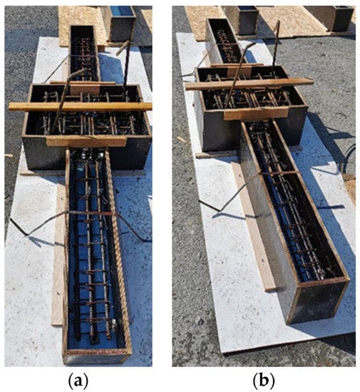Specimens’ molds and steel reinforcement configuration: (a) with continuous longitudinal bars; (b) with lap-spliced bars.
