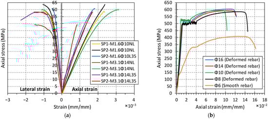 (a) Cylinder’s compression stress vs. lateral and axial strain curves for normal concrete; (b) Steel reinforcement tensile stress–strain curves.