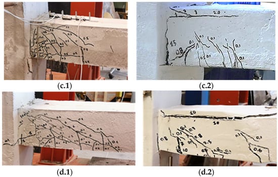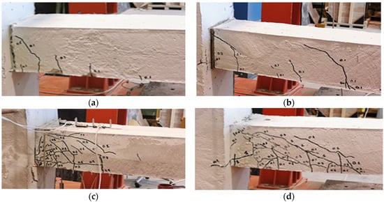 Failure patterns of specimens under monotonic loading: (a) M1.6Φ10ΝL; (b) M3.1Φ14ΝL; (c) M1.6Φ10L35; (d) M3.1Φ14L35.