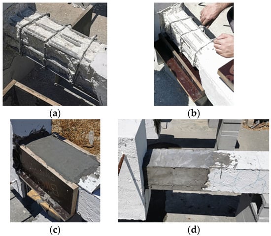 Figure 7b,c depict the placement of the ECC material in the cover of the specimen, lying in the horizontal direction during repair as during testing. To facilitate placement, an extendable form was used; first, the lower layer (bottom cover) was cast, as shown in Figure 7b, with the sides of the form extending upwards only 40 mm. Then, the extensions to the side forms were placed as shown in Figure 7c, and the side cover was cast, whereas the top cover and finishing of the free surface followed. Where cracking had been detected in the reaction members, they were strengthened with high strength repair mortar and CFRP wraps, in order to enhance their reacting capacity to the repaired study specimens.