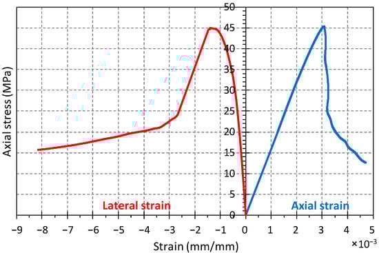 Cylinder’s compression stress vs. lateral and axial strain curves for fiber-reinforced concrete.