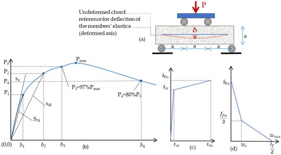 The tensile properties of the strain-hardening, fiber-reinforced cementitious material are derived from the resistance curve of a prismatic specimen loaded at the third-points along its span as depicted in Figure 9a []. The dimensions of the specimen are L, h, and b (clear span, section height, and width); in the present study, these values were 180, 60, and 100 mm, respectively. The tensile modulus of elasticity is , and the effective strain value is . Taking into consideration that after localization (at the peak point), the crack occurs at a horizontal distance from the mid-span in the constant moment region, where the peak displacement actually occurs, the corrected displacement of that midpoint is determined, . Next, the normalized parameters to are defined. See Table A1 for relevant expressions.
