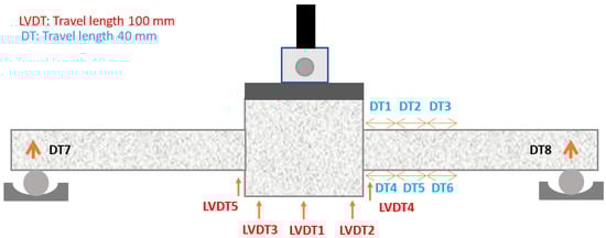 The instrumentation layout included five LVDTs (defined earlier) and eight displacement transducers (DTs) of different nominal gauge lengths (see Figure 10) to record the specimens’ deformations and displacements during the experiment. The positioning of the whole instrumentation equipment is depicted in Figure 10. For monitoring of the vertical deflection, five LVDTs were installed at the bottom center point of the element. DTs 7 and 8 were positioned at the ends of shear spans to measure the centroidal axis’s vertical displacement, and DTs 1 to 6 were installed at the top and the bottom sides of experimental specimens at the areas where the development of plastic hinge was expected. All measuring instruments were supported on an independent steel beam without having any contact with the reacting steel frame that supported the hydraulic piston.