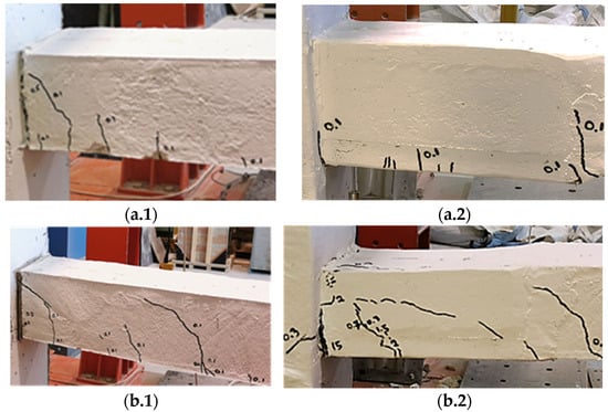 Failure modes of specimens: (a.1) M1.6Φ10ΝL vs. (a.2) RM1.6Φ10ΝL; (b.1) M3.1Φ14ΝL vs. (b.2) RM3.1Φ14ΝL; (c.1) M1.6Φ10L35 vs. (c.2) RM1.6Φ10L35; (d.1) M3.1Φ14L35 vs. (d.2) RM3.1Φ14L35.