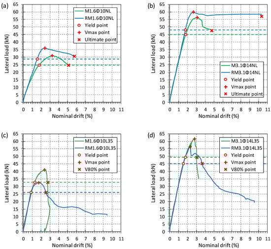 Envelope curves of specimens: (a) M1.6Φ10ΝL vs. RM1.6Φ10ΝL; (b) M3.1Φ14ΝL vs. RM3.1Φ14ΝL; (c) M1.6Φ10L35 vs. RM1.6Φ10L35; (d) M3.1Φ14L35 vs. RM3.1Φ14L35.
