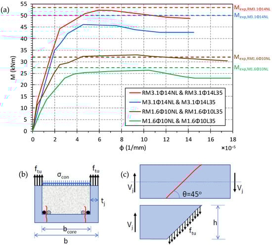 The calculated moment–curvature diagrams are plotted in Figure 13 for the typical cross-sections of specimens M1.6Φ10ΝL, RM1.6Φ10ΝL, M3.1Φ14ΝL, and RM3.1Φ14ΝL. The strength obtained in the respective test is plotted as well. It is noted that strength values are approximated closely by the flexural theory. Evidently, the actual influence of the ECC cover replacement is remarkable, underscoring the confining effectiveness of the jacket as well as its sustained tensile resilience to large strain levels, which was also sufficient to compensate for the initial stiffness loss of the damaged specimens (the retrofitted specimens were stiffer than the original cases).