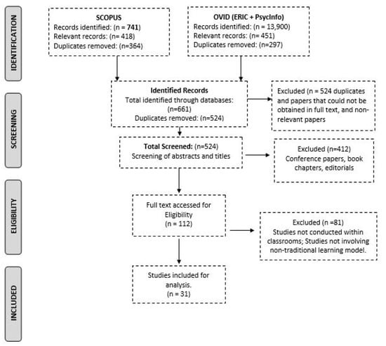 This systematic literature review was conducted in accordance with the guidelines set-out under the Preferred Reporting Items for Systematic Reviews and Meta-Analyses (PRISMA) []. The search was conducted using three scientific databases—Scopus, ERIC, and PsycInfo. The relevant records were exported to an Excel spreadsheet for the screening of abstracts and to identify the most relevant publications. Studies were included only if they satisfied all the following inclusion criteria items:
