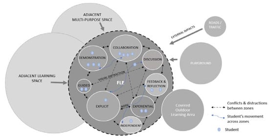One study [] observed zoning and territorialisation practices by the students and established that the educational practices were not restricted to the constitution of a simple ‘opening’ or ‘dissolving’ of boundaries, but rather a specific use of areas and places different for each student. A study in Poland conclusively suggested that the traditional corridor and classroom layout is oversimplified, inflexible in design, and found to work against learner-centered pedagogies that stress diversity and multiplicity []. Flexibility, flow, openness, and teamwork seem to guide recent school design [], and FLEs often have the capacity to hold more students than a traditional classroom []. The flexibility of the classroom interior, its versatility, and adaptability to change, is an important contemporary architectural issue []. Transparency is a significant characteristic of FLEs [,] along with a high degree of acoustic permeability [].