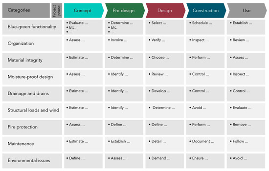 It was chosen to organize the challenge categories as listed in Table 1, elaborating on categories defined by Skjeldrum and Kvande [74] as well as SINTEF Building Research Design Guides. While the categories may be closely related to the various disciplines and areas of responsibility in a project (e.g., structural loads being the chief concern of the structural engineer) it is chosen not to label them as such, to prevent a situation where a reader of the framework will only focus on the content sorted under their own area of responsibility. Several of the listed concerns interface with several disciplines, for instance, the question of the water storage capacity of the roof. This design load will be a main concern both from a hydrology and structural engineering perspective and vital to guide further design decisions in both disciplines throughout the project.