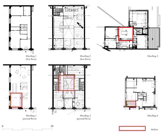 Additionally, despite differences between the individual dwellings, a recurring trait was the proportions of spaces dedicated to daily functions, which are consistently greater than those in traditional dwellings. Within these spaces, the kitchen area has particular importance (Figure 5). It is often perceived by the residents as the hinge and the most frequented space of the dwelling. In all the visited apartments, the kitchens are open, large and brightly lit. Contrarily, the bedrooms are usually minimally designed, conforming to the Brussels’ standards of 14 m2 for the parents’ bedroom and 9 to 12 m2 for the children’s []. This spatial disposition does not allow, as many residents testified, for many activities to take place in the bedrooms apart from sleeping.