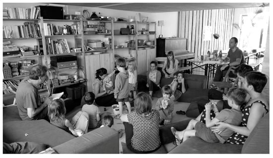 Third, the phenomenon of co-housing is new and cannot rely on traditions. Innovative practices emerge, unsettling conventional patterns (however, it should be noted that the gender issue does not appear in the charters containing the values shared by the groups of inhabitants). Through these inventions, “the patriarchal dwelling patterns may, however, change in a public or semi-public context, such as the shared spaces, where the modes of action and distribution of space and time are conducive to the integration of genders and generations” [].