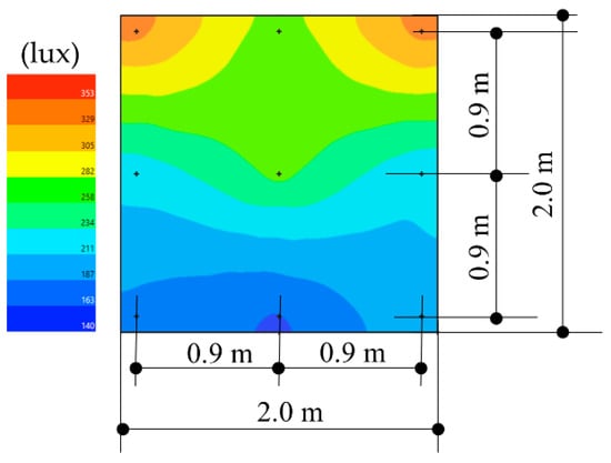 Annual luminous exposure from daylight was calculated for Wroclaw, a city in South-West Poland (51 deg. N lat.) with the use of the real weather data obtained from the Institute of Meteorology and Water Management, National Research Institute. Hv values were calculated on a grid of approximately 0.9 × 0.9 m at the surface of artwork by nine virtual sensors (measuring points). The highest record at the surface of an artwork—the worst-case scenario—was taken into account in the evaluation that is presented below, see Figure 2.