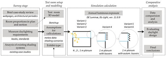 Architects and exhibition designers address a twofold problem: they need to consider the artworks’ preservation requirements and the visual comfort of the visitors. All existing buildings featured above have different dimensions of the exhibition hall and different proportions (depth/height) of the plenum space that illuminates the exhibitions. This paper suggests a procedure (computer simulation) to evaluate the annual luminous exposure K lx·h/year coming from daylight in the modeled test room with three different sizes of illuminating plenum size. The main aim of the presented paper is to verify if it is possible to limit the annual luminous exposure (K lx·h/year) below the thresholds defined by various conservatory institutions, bodies, or individual researchers by modifying the proportions of the plenum and by the use of additional automatic shading louvers. More precisely, the objectives of this study are (i) to determine the level of Hv (annual luminous exposure) from daylight using the adopted test room and real weather data, (ii) to specify the technical solution to adequately regulate the level of daylight, and (iii) to determine what type of artwork can be displayed in the proposed test room. It also appears to be a significant challenge to design a potential shading system and its triggering parameters to adequately limit the amount of daylight in the room for the protection of precious artworks.