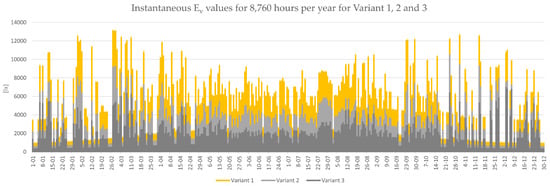 Instantaneous Ev values for 8760 h per year for Variant 1, 2, and 3. Please note, the graph is not showing exactly all 8760 values of Ev, but was scaled to fit the page. Exact values are given in the data file in Supplementary Materials.