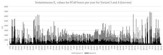 Instantaneous Ev values for 8760 h per year for Variant 3 and 4. Please mind, the graph is not showing exactly all 8760 values of Ev, but was scaled to fit the page. Exact values are given in the data file in Supplementary Materials.