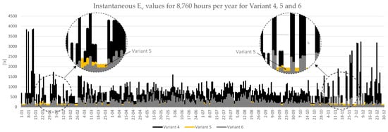 Instantaneous Ev values for 8760 h per year for Variant 4, 5, and 6. For visibility, Variant 5 is shown in yellow for better contrast. Please mind, the graph is not showing exactly all 8760 values of Ev, but was scaled to fit the page. Exact values are given in the data file in Supplementary Materials.