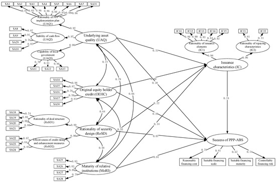21]. The four success attribute groupings, numbering from SA1 to SA13, from SA14 to SA17, from SA18 to SA24 and from SA25 to SA28, can be described as underlying asset quality (UAQ), original equity holder credit (OEHC), rationality of security design (RoSD) and maturity of relative institutions (MoRI), respectively. The continued success of securitization depends on the efficiency of resource usage and ensuing competitiveness. That is, underlying asset quality (UAQ) has a positive influence on the success of PPP–ABS programs [