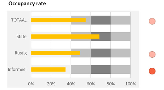 After the first workshop, the indicators stay duration and energy use were omitted as they were found to be of less importance to determine the performance of the study place portfolio (see Section 3.3.1). Furthermore, two other dashboards were made (see Appendix A): one in which the main dashboard displayed the performance per building rather than per type of study place, and another that offered a more detailed insight into the performance on four criteria. These were tested in workshop 2.