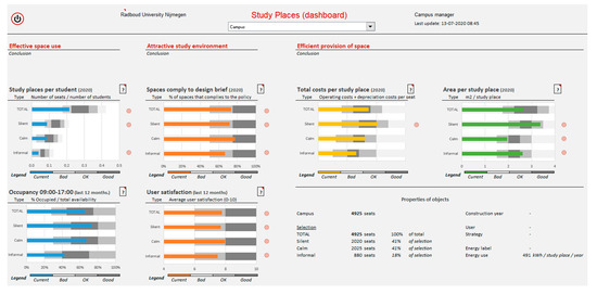 The RU campus has around 28 university buildings, six of which contain study places. Beyond their location, not much information on study places is available. The floor area per study place and costs of each building are known. However, the number and type of study places are not registered. In the dashboard, information is required on room level, including floor area, type, capacity and costs. Consequently, what was displayed in the dashboard prototypes had to be supplemented with hypothetical, plausible data, both for the real estate indicators and the information that would be delivered through IoT. This should not influence the quality of the results. Even with fictive data, workshop participants could assess the performance of the real estate portfolio and define interventions based on that. Any deviation from reality would not impede utilization of the indicators included in the dashboard and, therefore, the workshops would still provide the envisaged feedback.