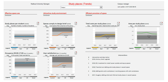 The dashboard design for RU was determined by two information needs that must be satisfied: (1) establishing the match between the demand for spaces and the supply of spaces and (2) identifying trends that may impact the future demand for spaces. This led to the initial division into two dashboards (Figure 5 and Figure 6). Each dashboard initially contained eight indicators, four related to the provision of real estate and four related to space use: study places per student, average stay duration, the percentage of spaces that comply to the brief, user satisfaction, total costs per study place, occupancy, floor area per study place and energy use per study place. In the main dashboard, the performance on each indicator was visible for every type of study place and the whole portfolio. In the trends dashboard, the performance on the whole portfolio over the past five years was visible. In both dashboards, the user could navigate between viewing the performance on a campus-level or selecting a specific building.