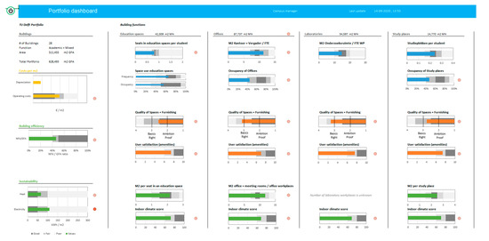 Dashboards can also be positioned against multiple criteria decision analysis (MCDA) approaches. Here, dashboards and MCDA approaches are seen as complementary rather than competing. MCDA deals with the structuring and solving of problems involving multiple criteria, such as the problems studied in the cases of this research. There is a broad range of MCDA approaches available, which have also been applied to problems in real estate management [21,22]. Following the results of our previous research, we focused on a specific activity in the decision-making process: the overview of the supply of real estate and its performance. Dashboards are well-suited to provide such an overview in a visual display, on a single screen. The objective of this overview was to create a basis for subsequent actions. In subsequent steps of this decision-making process (defining strategies and weighing and selecting strategies), MCDA approaches are usable. A dashboard combining information from the IoT with other campus management indicators actually provides a reliable basis for MCDA modelling of decisions and their impact on the criteria displayed in the dashboard.