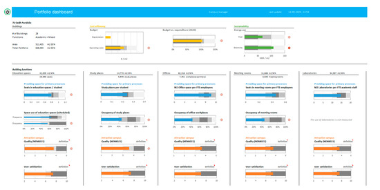 The design of the dashboards in this research is based on a knowledge base combining theories and instruments from corporate real estate management (CREM), building automation, the IoT and information management. The dashboard is further detailed using design principles for dashboards as outlined by Few [19]. Following the earlier definition by Few (see Section 1), there are several requirements for dashboards—just as in a dashboard of a car: a dashboard should not display all information, but the information that is needed to perform a specific activity such as driving a car. This information is collected from multiple sources: a car dashboard obtains data from sensors in the tank, engine, transmission, etc., to report fuel levels, speed, rotations, etc. Finally, information is reported succinctly and meaningfully to the user, e.g., by showing a meter with thresholds for maximum speed or for fuel tank content, or simply by displaying an alert when a seatbelt is not used.