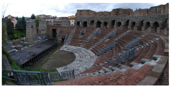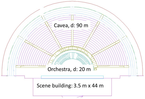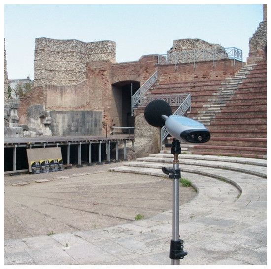 During the Imperial Roman period, thousands of theatres were built [1,2,3]. The theatres were built to entertain people and create venues for shows [4]. The theatre represented the symbol of the greatness of the city, and it was used for political meetings, satirical representations and comedies [5,6]. The best-preserved theatres are in Italy, Spain, France, Turkey and Jordan. The first theatres were built in Greece, with the cavea resting on the slope of a hill. At first, the cavea had linear steps, however later, the cavea was built with a concentric stepped structure to improve the vision and to allow a more optimal sound distribution, and the legend of the good acoustics of the Greek theatres was born. The principal elements of the ancient theatre are scene building, orchestra and cavea, as shown in Figure 1. The architect Vitruvius (1st century B.C.), in the tract called “De Architectura,” described the geometrical theatres’ characteristics. In the 5th book, the fundamental principles for achieving correct vision and for listening to the theatrical performances are introduced. There are a few simple rules to follow to obtain good acoustics inside theatres, for example, the edges of each step should be in a straight line from the first to the last seat to prevent the sound from finding obstacles during the propagation [7,8]. In this paper, the acoustic characteristics of the Roman theatre of Benevento, in its current state, are discussed. Benevento (South of Italy) was an important city during the Roman period, and the theatre was built in the second century A.D. The orchestra measured 20 m diameter, the cavea measured 90 m diameter, while scene building measured a width of 44 m, with 25 arcades on three levels [9]. The scene building (pit stage) had three open doors, and it was made up of two orders of columns with a sloped wooden roof. The height of the stage was 1.5 m, so the spectators are able to see the actors on the scene building.