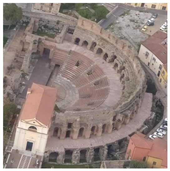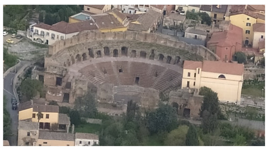 Figure 2 shows the ruins of the theatre in a painting of 1759 ca. (A. Joli, view of Queen Maria Amalia of Saxony in Benevento). The theatre had only a few external arcades and the first level was covered with earth, and houses were built inside the theatre. Figure 3 shows a picture of the early 1900s with the houses inside the cavea. During the restoration works, the houses inside the cavea were demolished and only the church remained. The cavea was rebuilt following the geometric rules described by Vitruvius, while the scene building was rebuilt with two lateral walls. The “ima cavea” was rebuilt with fifteen steps with terracotta bricks. The steps have the dimensions: height of 0.40 m and depth of 0.70 m, with the cavea slope of 30°. The “summa cavea” was partially rebuilt. Figure 4 and Figure 5 show the internal view in the current state, while Figure 6 and Figure 7 show an aerial view.