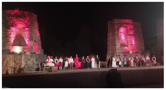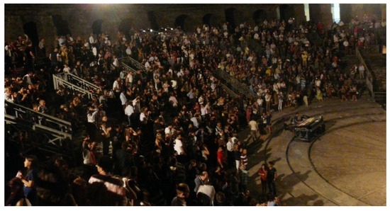 After the end of the restoration works, the theatre was reopened on 26 June 1957, with a comedy of the ancient Greek (Ecclesiazusae or The Assembly women by Aristophanes). For security reasons, the maximum capacity is 1800 spectators. The theatre is used for different types of shows (prose, opera, jazz, music concert). Figure 8 shows the scene building during a performance in the summer season, while Figure 9 shows the orchestra and cavea during a performance.