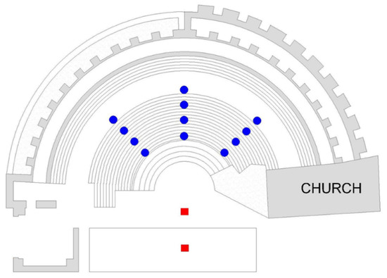 Positions of sound source (scene building and orchestra) and the positions of the receivers in the cavea. The squares in red indicate the position of the source, while the circles in blue indicate the positions of the receivers.