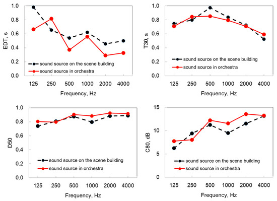 Referring to the position of the sound source in the orchestra and on the scene building, Figure 12 shows the average measured values of the acoustic parameters: EDT, T30, D50 and C80, in the octave band frequencies from 125 Hz to 4000 Hz, in accordance with the ISO 3382 standard [27,28,29]. The measured average values show the synthesis of the twelve measurements obtained in the cavea.
