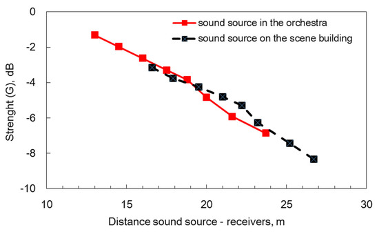 Average values of the strength (Gmid, dB) as a function of the distance from sound source to receivers, with sound source on the scene building and in the orchestra.