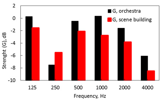 Figure 14 shows the average values of the strength (G, dB) in frequency function (octave bands) from 125 Hz to 4000 Hz, with sound source on the scene building and in the orchestra. The strength (G, dB) values, in the frequency domain, are greater, as expected, for the position of the sound source in the orchestra.