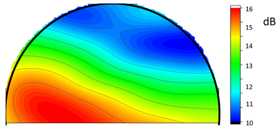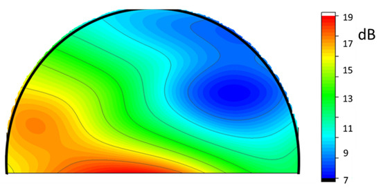 Figure 15 shows the spatial distribution of C80 (dB) measured values at the frequency of 1000 Hz, when the sound source is on the scene building. The points of the cavea closest to the scene building have a higher value of C80, while in the upper right area of the cavea, the C80 value tends to decrease. However, the value of C80 does not present optimal conditions for listening to music. Figure 16 shows the spatial distribution of C80 (dB) measured values at the frequency of 1000 Hz, when the sound source is in the orchestra. Additionally, in this configuration, the points of the cavea closest to the scene building have a higher value of C80, while C80 decreases in an area at the top of the cavea (blue area) by the effects of the sound reflections due to the presence of the church walls.