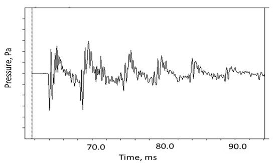 Figure 21 shows the measured impulse response value, when the sound source is on the scene building, while Figure 22 shows the measured impulse response value when the source is in the orchestra and the measurement microphone is on the octave step of the cavea (halfway of the cavea). For both configurations, the impulse response is composed of a succession of sound reflections. The first impulse is due to the direct sound, and the second impulse is due to the sound reflection on the orchestra floor. Then, the steps of the cavea produce multiple reflections that contribute to the reinforcement of the direct sound.