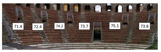 The acoustic measurements show values of reverberation time (T30) equal to 1.0 s (Figure 12). The insufficient effects of sound reflections means that the actors or singers voices arrive weakly on the steps of the cavea. With the sound source in the orchestra, the values of the measured reverberation time (T30) were lower at middle frequencies. Early Delay Time (EDT) parameters (Figure 12) are smaller due to the absence of reflective surfaces at the scene building and other architectural elements. The parameter clarity (C80) for musical performances is considered (Figure 12). The optimum range for symphony concerts for objective clarity (C80) appears to be between −2 and +2 dB, which is far from the values for good listening for musical performances. While the acoustic measurement values (C80) are equal 10 dB, the parameter definition (D50) (Figure 12) is over 0.8, so in accordance with Table 2, the theatre has good characteristics for speech performances. The average values of STI are excellent, in fact STI is equal to 0.81 with sound source on the scene building and STI is equal to 0.84 with sound source in the orchestra. The theatre has good acoustic characteristics for understanding speech; in fact, it is good in every point of the cavea. The reverberation time (T30) increases at the frequency of 500 Hz. This effect is due to the reflections of the sound waves on the steps. The steps dimensions are height equal to 0.40 m, and depth equal to 0.70 m. At the frequency of 500 Hz, the wavelength (λ) is equal to 0.7 m, the dimension of step depth, so at this frequency, there is an effect of sound amplification as the reverberation time increases. The ancient theatres were famous for their “good acoustics”. Many scientists have investigated this legend and many papers have been written. The secret of good acoustics is linked to the diffusion of sound on the steps—the tiers are regular surfaces that allow a good diffusion of the sound and therefore to obtain good acoustic performances [34,35]. In order to assess the acoustic characteristics of the Roman theatre of Benevento in the actual configuration, a comparison was conducted with the acoustic parameters measured in empty conditions in the open-air theatres of Pompeii (large theatre and Odeon), Cassino, Posillipo, Taormina, Segesta and Siracusa [36,37,38,39]. The average values of the monaural parameters at the mid-frequency bands of 500 Hz and 1000 Hz are reported in Table 4. From the comparison with the other reconstructed open-type theatres, the Benevento Roman theatre does not have the shortest reverberation time. The acoustic parameters are comparable to those measured in other open space theatres.